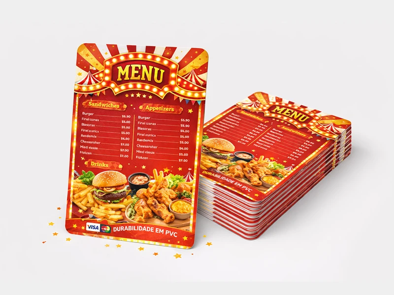 Nossa impressão em PVC é durável e resistente à umidade, garantindo que seu cardápio permaneça em boas condições por muito tempo. Além disso, a superfície lisa facilita a limpeza e manutenção, tornando-o uma escolha prática para ambientes de comida e bebida.