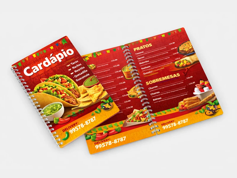 Ofereça uma experiência única para seus clientes com nosso cardápio Wire-o personalizado. Com tamanho 13,6x21,1 cm, é perfeito para restaurantes, bares e cafés. Nossa equipe de design irá criar um layout atraente e funcional para o seu cardápio, destacando os pratos e bebidas mais populares. Com a opção de escolher o material e as cores, você pode personalizar o cardápio para atender às necessidades da sua marca.