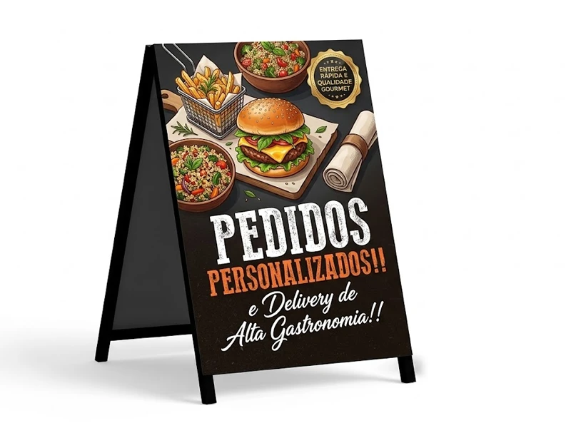 Destaque sua marca ou produto com nosso cavalete personalizado em lona 440g. Com tamanho de 90x60cm, é perfeito para eventos, feiras e exposições. Nossa equipe de design irá criar um layout personalizado de acordo com as suas necessidades e preferências. Além disso, nossa tecnologia de impressão de alta qualidade garante cores vibrantes e duráveis. Com um prazo de produção de apenas 5 dias úteis, você pode ter seu cavalete personalizado em mãos rapidamente. Não perca mais tempo e encomende agora mesmo!